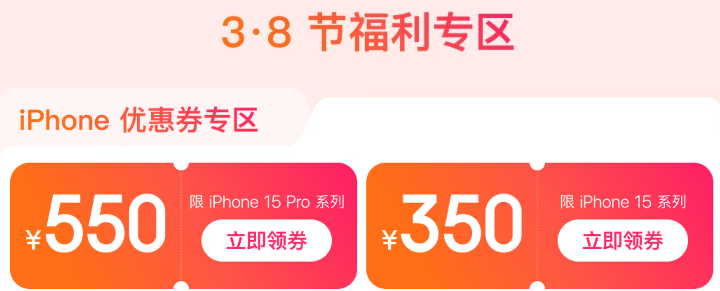 苹果的促销真的是迫不及待啊,2月都还没有过完,三八的活动就出来了。iPhone15系列领券减350元,iPhone15 pro 系列领券减500元。