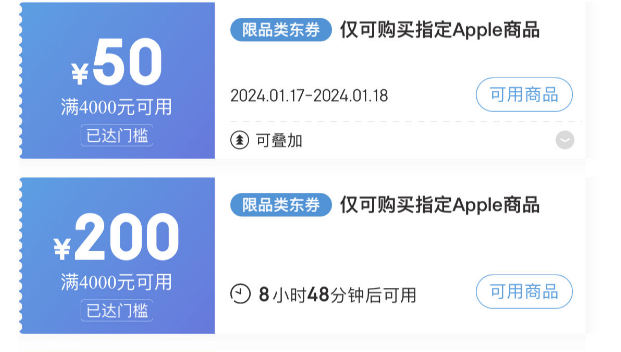 iPhone15 pro与iPhone15 pro max在直降600元的情况下,可以再领一张50元和一张400元的券,也就是说同样是降了1050元,使用时间也是一样,50元现在就可以使用,400元券需要等到17日晚上八点。