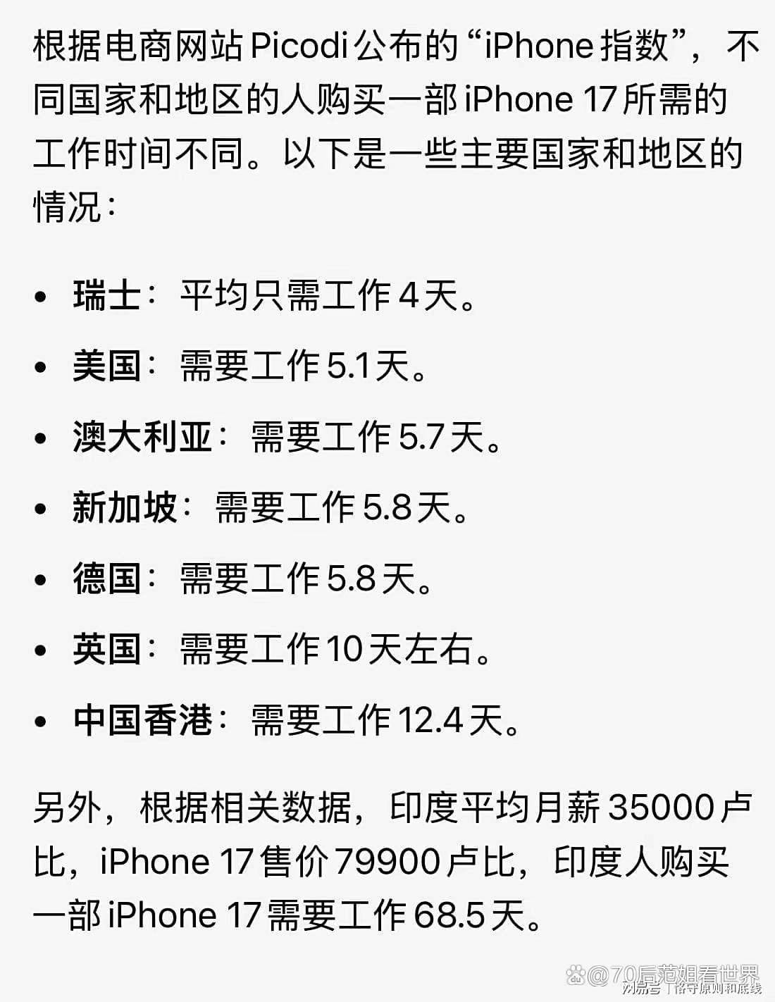 另外,根据相关数据,印度平均月薪35000卢比,iPhone17售价79900卢比,印度人购买一部iPhone 17需要工作68.5天。