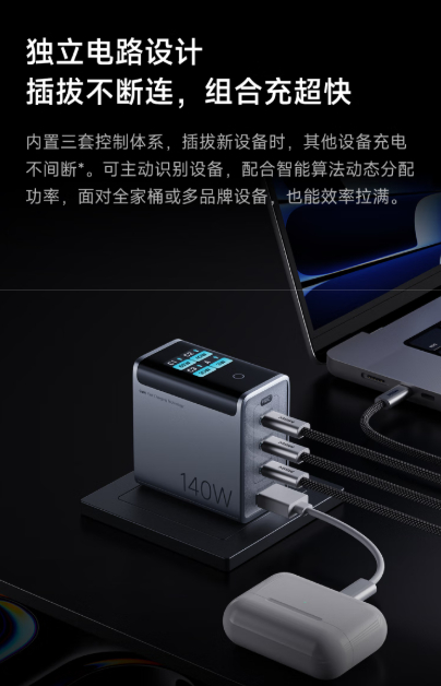 第二、1.3英寸臻彩高清TFT智能屏,让充电效率可视化!针对传统充电器"充电状态全凭盲猜"的用户痛点,可实时精准显示总输出功率、各接口输出功率、设备充电温度、最佳接口推荐等核心信息,结合240×240dpi高分辨率,让充电状态一目了然。其中“最佳接口推荐”功能可根据接入设备的功率需求,智能推荐最优供电接口,让用户充电效率进一步提升。