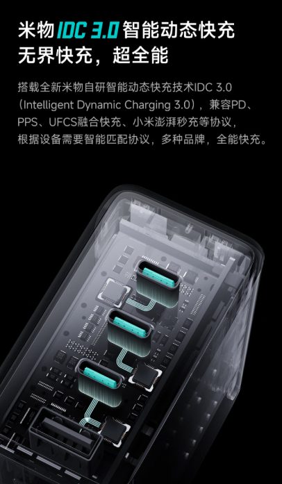 第四,全新米物自研智能动态快充技术IDC 3.0(Intelligent Dynamic Charging 3.0),充电过程中能够根据各个设备的规格、协议、电量等做实时智能分配,并且动态调节,比如在给电池容量更高的笔记本与电池容量相对较低的手机同时充电时,会进行智能分配功率,输出功率可达 100W+30W。相对电量较满的设备,会实时动态分配相对更多的功率给到电量告急的设备,一句话概括就是“按需分配,实时调控,最佳能效,快到飞起”!