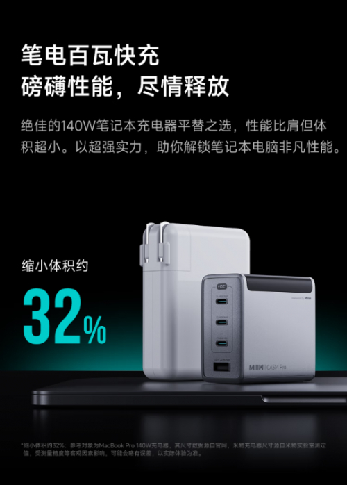 实测为小米15 充电30分钟可充满约82%。更是绝佳的140W笔记本电脑充电器,性能比肩原厂,且体积缩小约32%,为MacBook Pro 16(M3)充电30分钟恢复约56%电量。