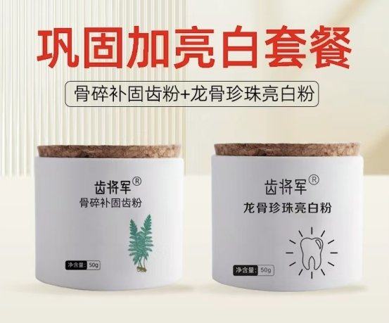 齿将军龙骨珍珠亮白粉与骨碎补固齿粉共同构成“早晚搭配”护理方案:清晨使用亮白粉,有效清洁焕新口腔,去除夜间残留物及表面浮渍;夜晚则选用固齿粉,深入滋养,修复牙根与牙龈。双重草本精华守护,无额外化学添加剂,适合全家老少安心使用,全面覆盖日常口腔护理需求。