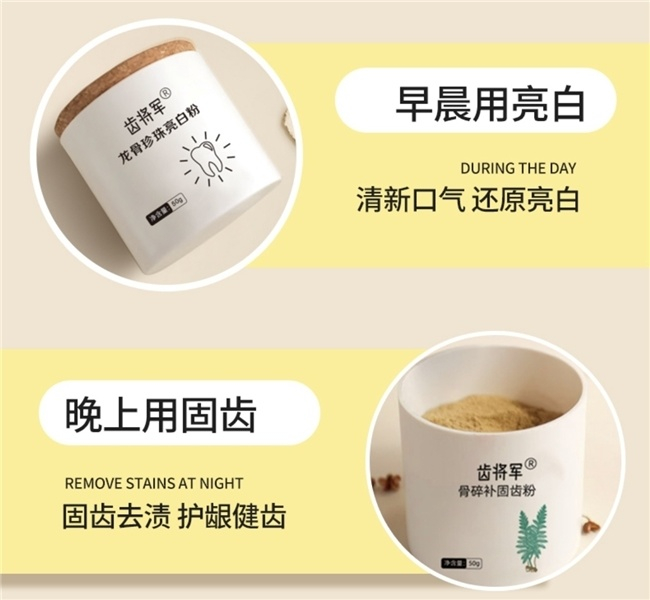 齿将军龙骨珍珠亮白粉与骨碎补固齿粉的 “早晚搭配” 堪称黄金组合:早上用龙骨珍珠亮白粉清洁美白、清新口气,开启一天自信状态;晚上用骨碎补固齿粉深层滋养、稳固牙周,夜间持续守护口腔健康。两款产品均采用天然草本配方,无刺激性成分,老人、小孩、孕妇均可使用,全家共享安心口腔护理。