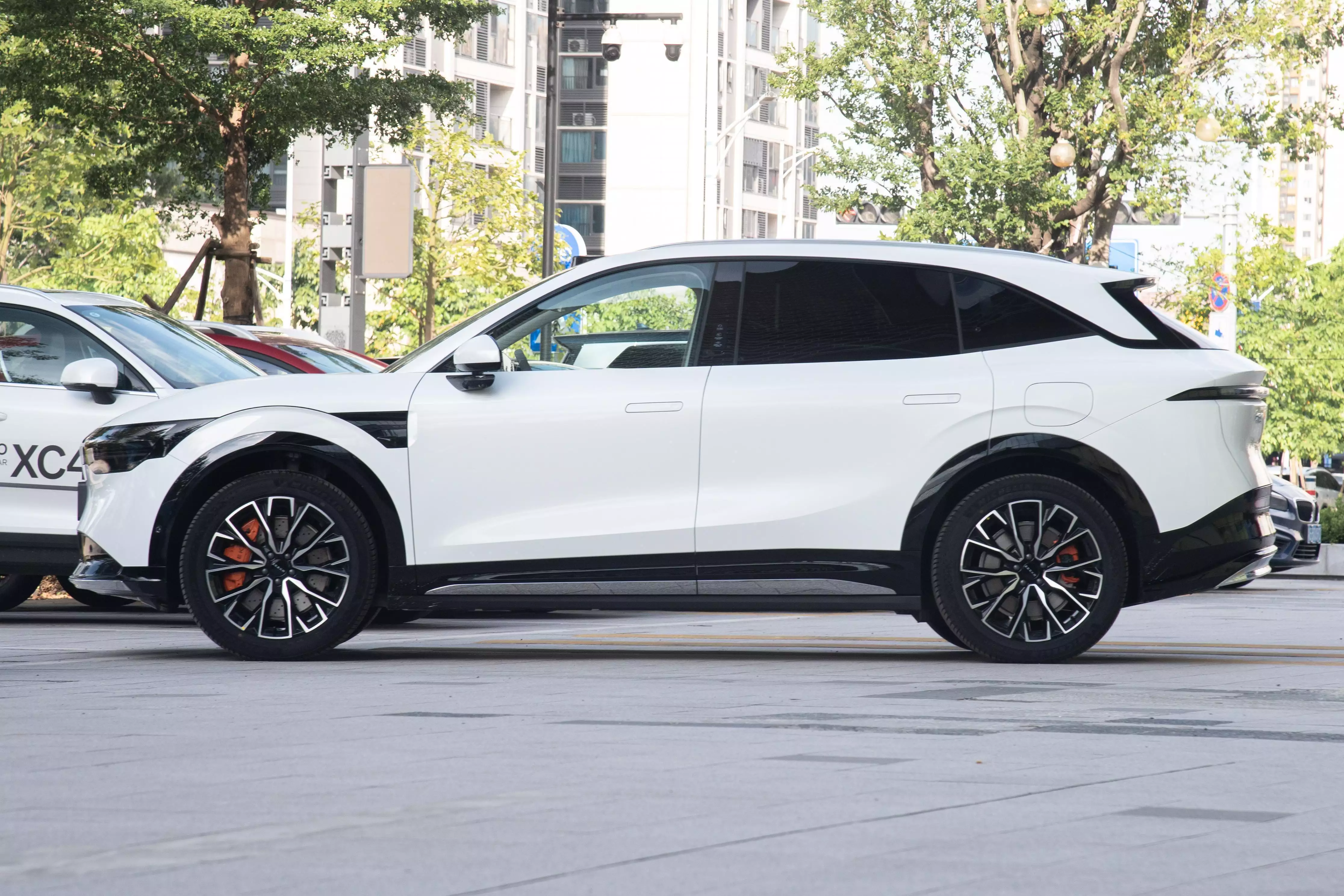 车身侧面,极氪7X展现出中型SUV的大气与稳重。光滑平整的车身表面,隐藏式门把手和无框车门等设计元素为车辆增添了科技感。车窗四周的镀铬饰条提升了时尚感,后排玻璃的熏黑处理有效保护了乘客隐私。19英寸花瓣式轮毂搭配红色运动卡钳进一步提升了车辆的精致感。