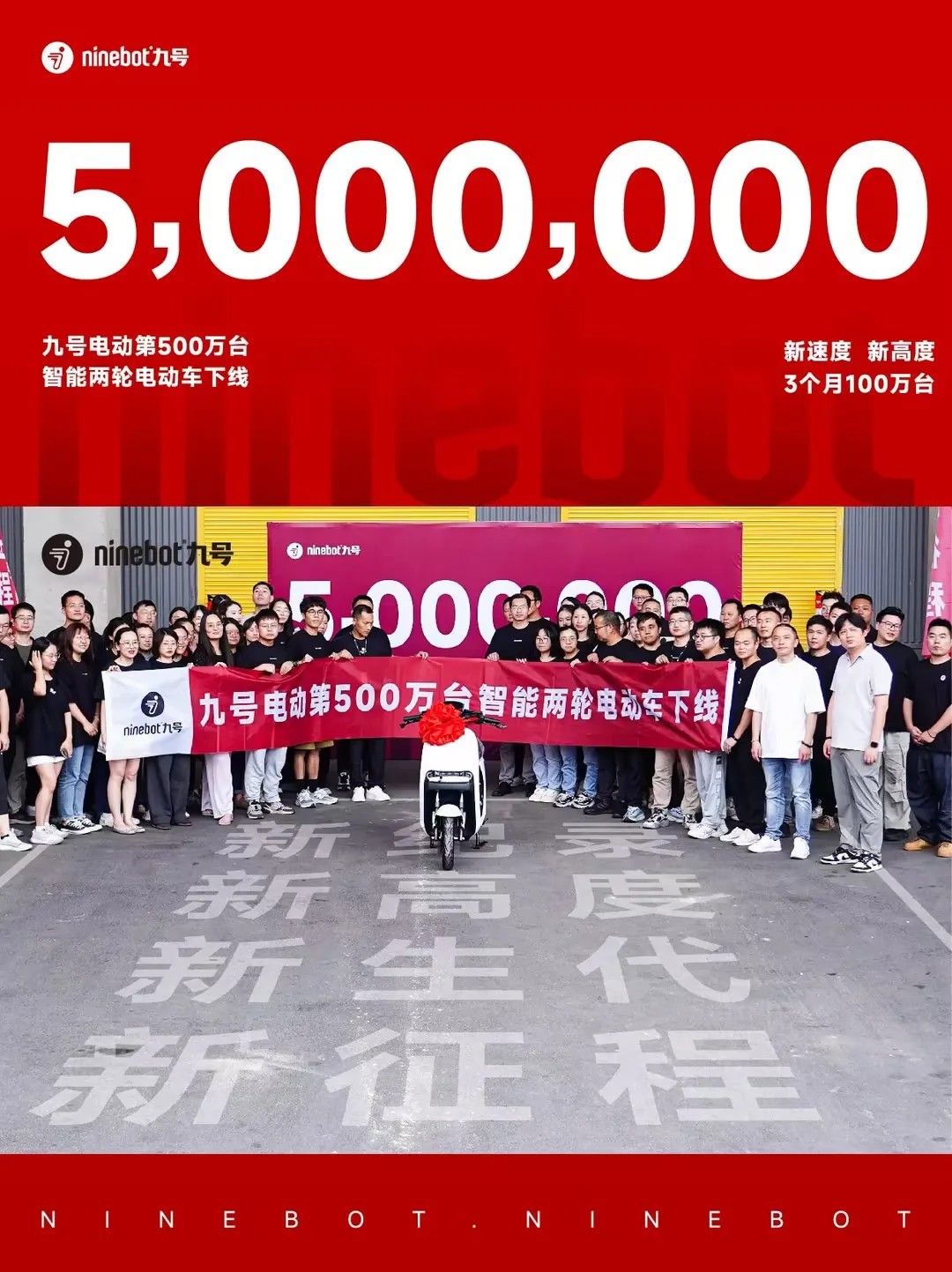 九号公司中国经营事业部总裁何飞龙表示:“这既是九号电动里程碑式的突破,也是新征程的开始。站在500万台的新起点上,九号电动将继续稳扎稳打,继续扎硬寨打呆仗,迎接下一个100万台的跨越。”