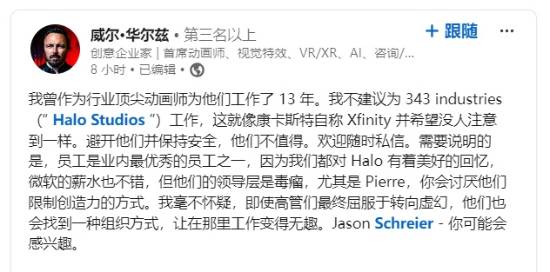 然而,343的前动画师主管Will Waltz开始爆料,揭示了该公司管理层存在的严重问题。他直接指责现任负责人Pierre Hintze,并建议其他人不要为该工作室工作,因为他认为公司不值得信赖。