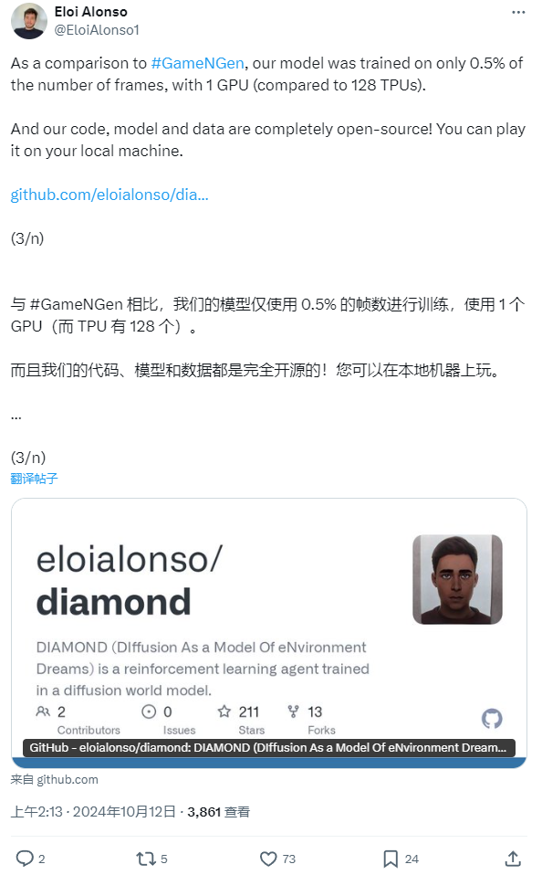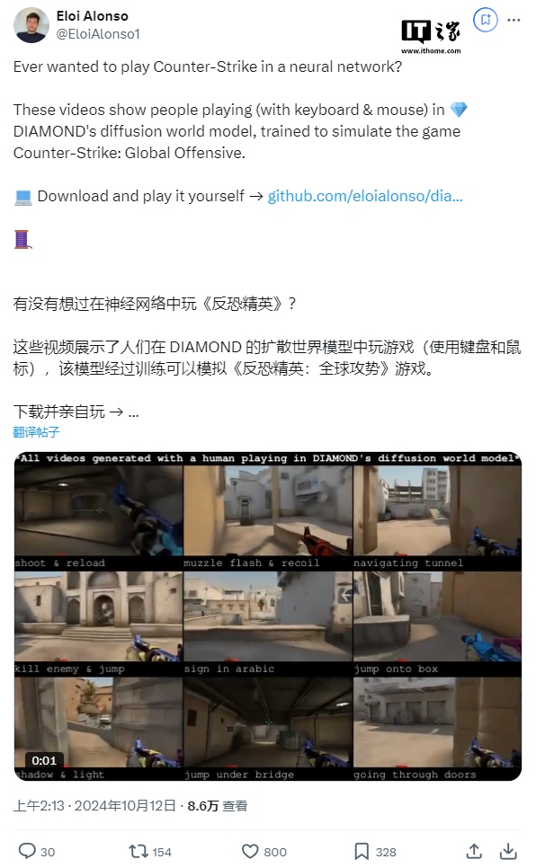 开源 AI 项目“DIAMOND”负责人 Eloi Alonso 今天公布了这段用神经网络运行《CS:GO》“世界模型”的演示视频,并详细介绍了其中存在的许多问题,例如在 RTX 3090 平台上仅有 10 FPS。