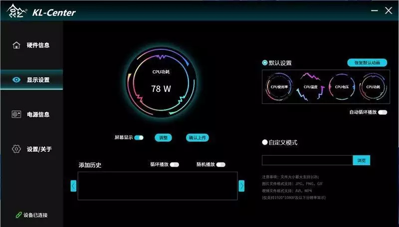 如果你有鑫谷昆仑二代、MU-360水冷,还可以通过KL-Center软件,将电源与水冷的屏幕跨界互联,在水冷头的屏幕上显示电源的各种状态信息。