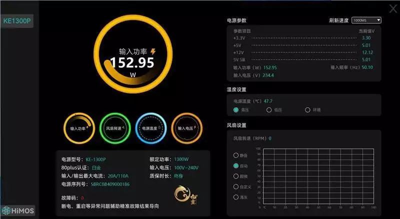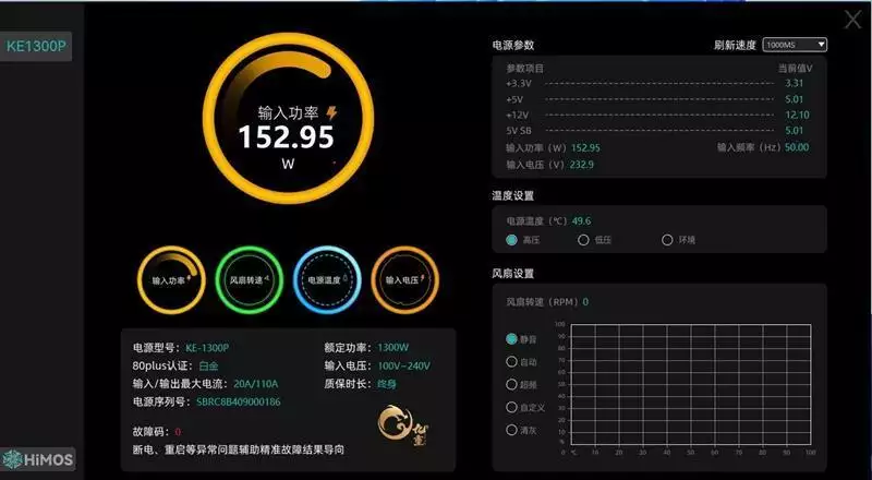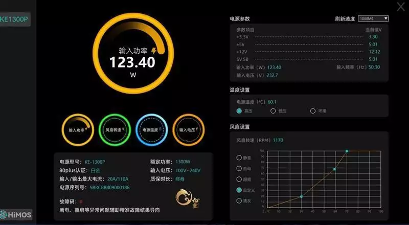 昆仑九重KE-1300P电源可以通过附赠的线缆连接到主板的USB插针上,可以通过HIMOS软件对电源进行控制。