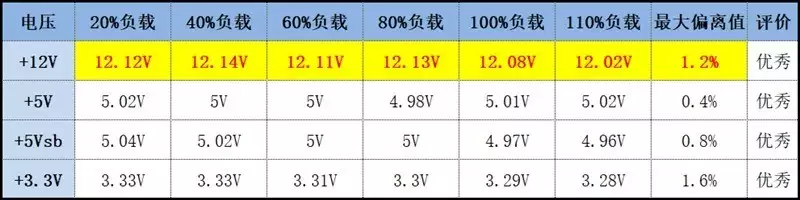 鑫谷这款电源从始至终都保持在12.10V以上,就算是110%的负载都有12.02V,完全不用担心过载时电压不稳电流过大而导致硬件烧毁的情况。