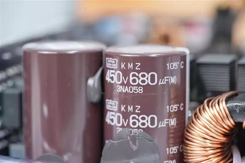耐压450V、耐高温105度,容量680μF,2个加起来总量1360μF,轻松应对1300W额定功率。