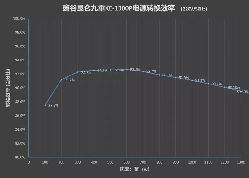 在220V/50Hz的市电环境下,鑫谷昆仑九重KE-1300P电源的转换效率几乎全程保持在90%以上。