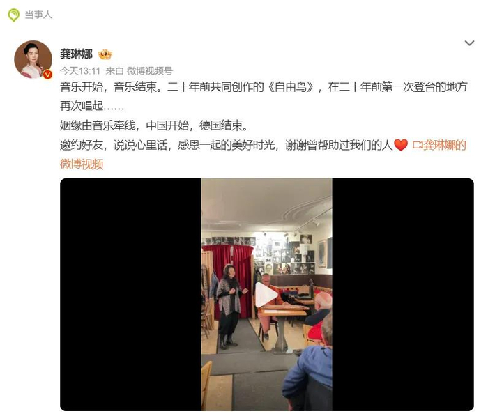龚琳娜原文中写道:“姻缘由音乐牵线,中国开始,德国结束。邀约好友,说说心里话,感恩一起的美好时光,谢谢曾帮助过我们的人。”