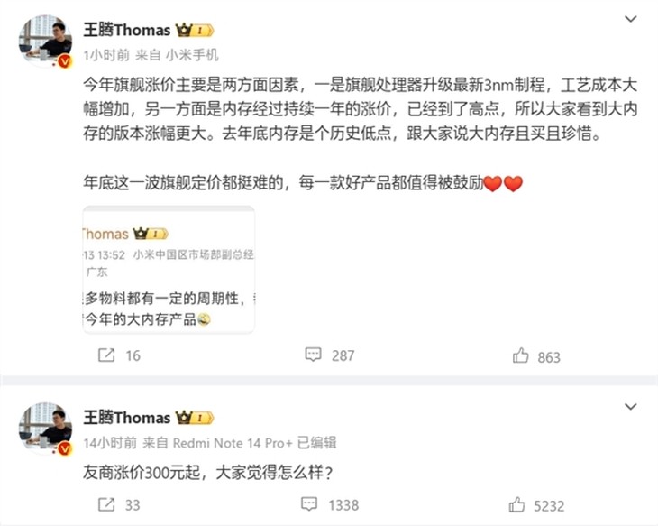 小米15和Redmi K80也将在涨价行列中。对此,小米副总裁王腾表示,涨价主要受两大因素影响。一方面,旗舰处理器升级至新的3nm制程,导致工艺成本大幅增加;另一方面,内存经过一年的持续涨价,现已达到高点,尤其是大内存版本的价格涨幅更为明显。他提到,去年底内存处于历史低点,当时就建议消费者珍惜大内存的机型。