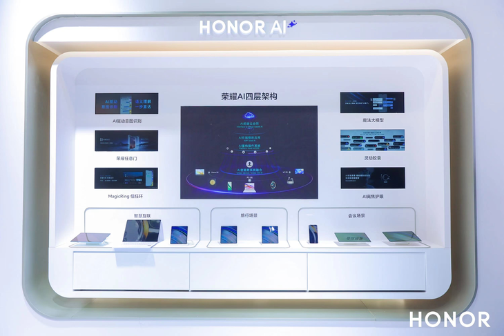 在荣耀展台的HONOR AI主题专区,荣耀展出了一系列领先的端侧AI成果,包括AI任意门、跨系统跨平台的智慧互联、AI使能硬件的离焦护眼等自研技术。