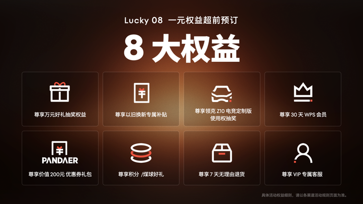 即日起,魅族 Lucky 08 手机一元权益超前预订同步开启,只需花费一元,用户即可尊享包括星纪魅族 x 领克 Z10 电竞定制版使用权抽奖(价值 49999 元)、万元好礼抽奖、以旧换新专属补贴、 WPS 会员、 PANDAER 优惠券礼包、积分好礼、7 天无理由退货以及 VIP 专属客服 8 大权益。