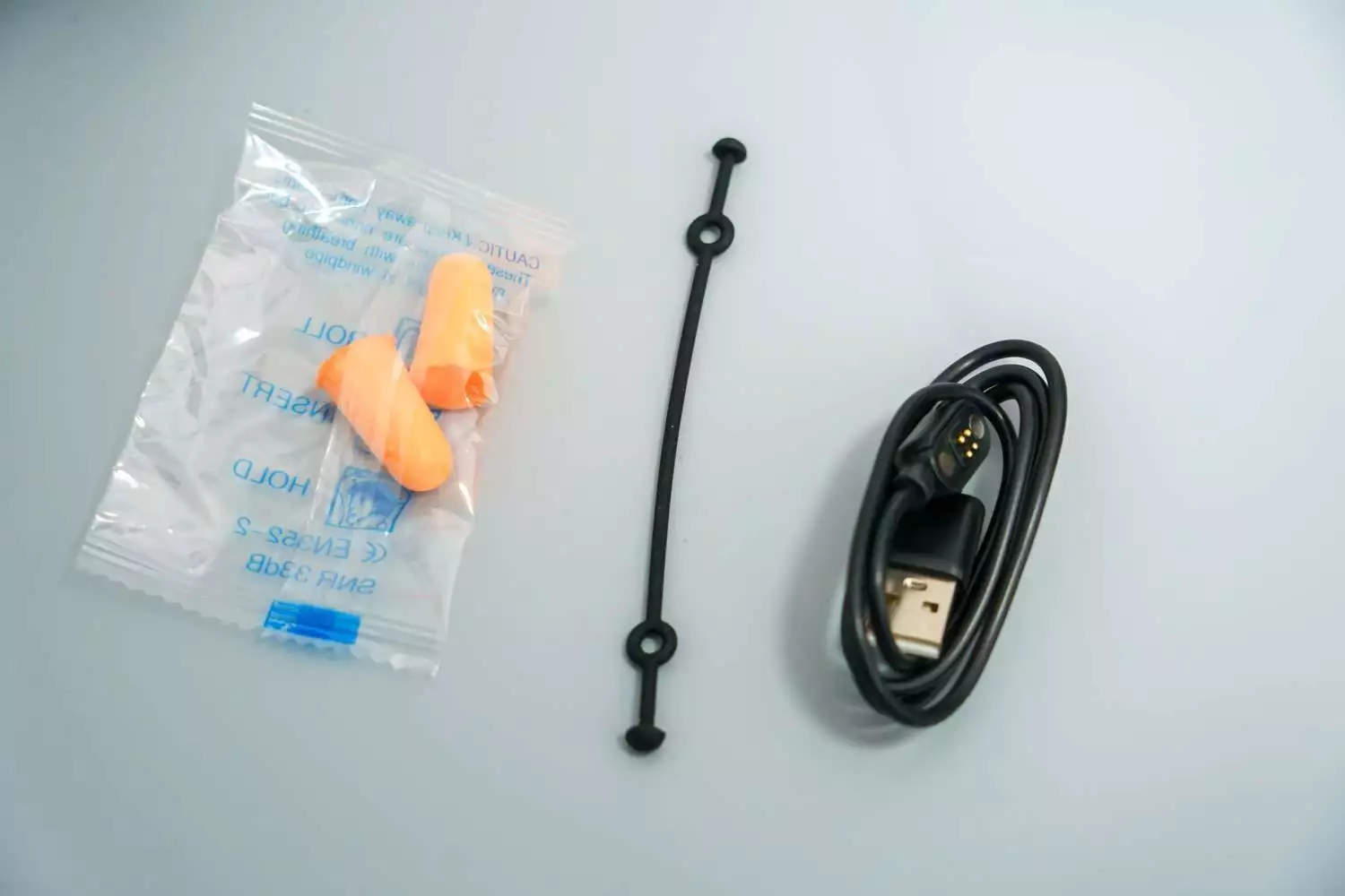 配件方面,它还配备了一对入耳式的耳塞,可以起到隔音,加强骨传导声音音质的效果。另还有一条磁吸式的充电线,一条硅胶材质的松紧带,用来调节头戴的尺寸的。