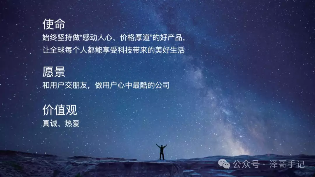 首先,从小米的使命、愿景、价值观谈起。使命:始终坚持做“感动人心、价格厚道”的好产品,让全球每个人都能享受科技带来的美好生活。愿景:和用户交朋友,做用户心中最酷的公司。价值观:真诚、热爱。
