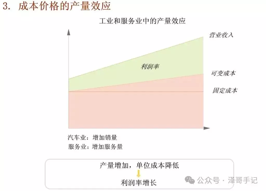 首先,我们先讲一个概念,即产量效应,指随着生产规模的扩大,单位产品的成本逐渐降低,总营收增加得现象。这主要是由于在生产过程中,固定成本(如设备、租金等)可以分摊到更多的产品上,这种现象也叫“规模经济”。