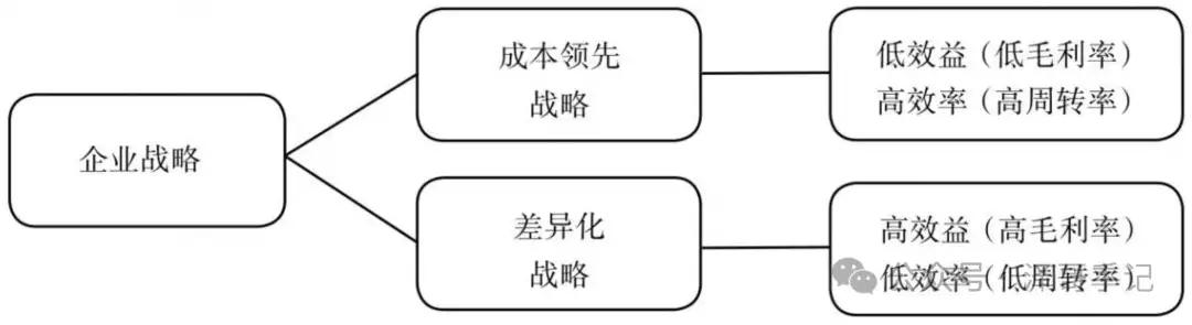 选择差异化战略的企业,因投入成本较高,或因溢价,定价则相对较高,而购买产品的用户偏少,产品卖的慢,有点类似“三年不开张,开张吃三年”(这个比喻不那么恰当),即:高效益、低效率,也就是毛利率高、周转率低,属于效益制胜。