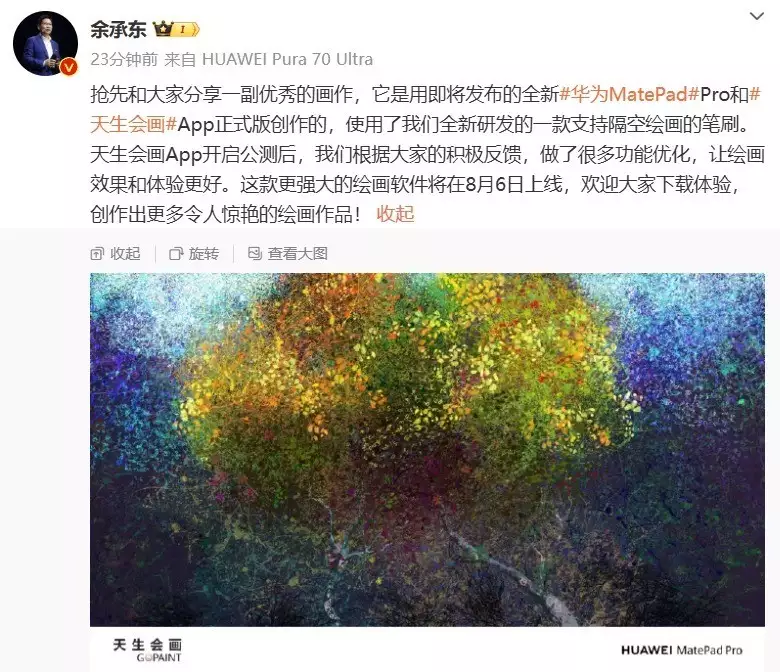 华为常务董事、终端 BG 董事长、智能汽车解决方案 BU 董事长余承东今日也发布预热消息,天生会画 App 正式版包含一款支持隔空绘画的笔刷,该版本将在 8 月 6 日上线。