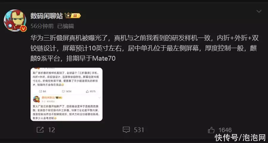 根据知名数码博主@数码闲聊站的消息,华为这款三折手机的发布日期将早于华为Mate 70系列。考虑到华为Mate 60系列的发布时间,预计Mate 70系列可能在9月底发布,而三折手机将会在此之前推出。
