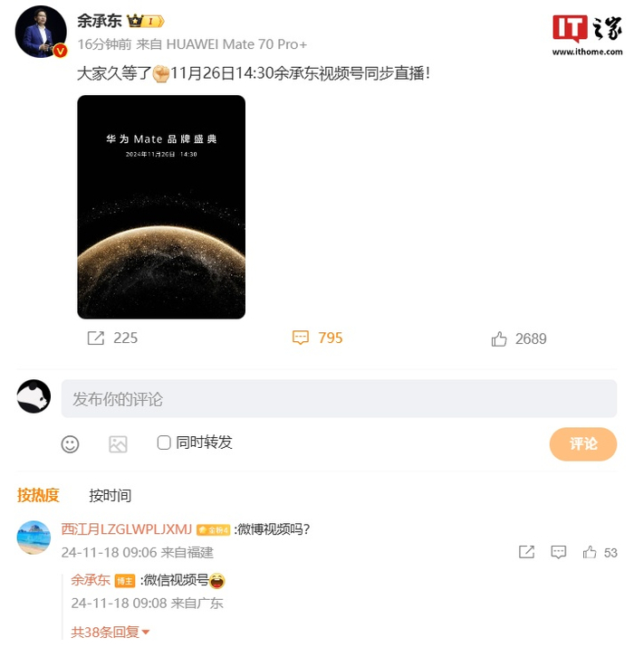 IT之家 11 月 18 日消息,华为终端今天上午宣布,华为 Mate 品牌盛典将于 11 月 26 日 14:30 举行。