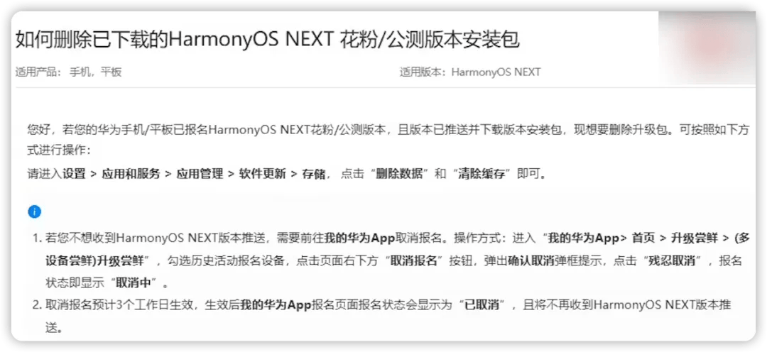 生效后,我的华为 App 报名页面报名状态会显示为「已取消」,且将不再收到 HarmonyOS NEXT 版本推送。