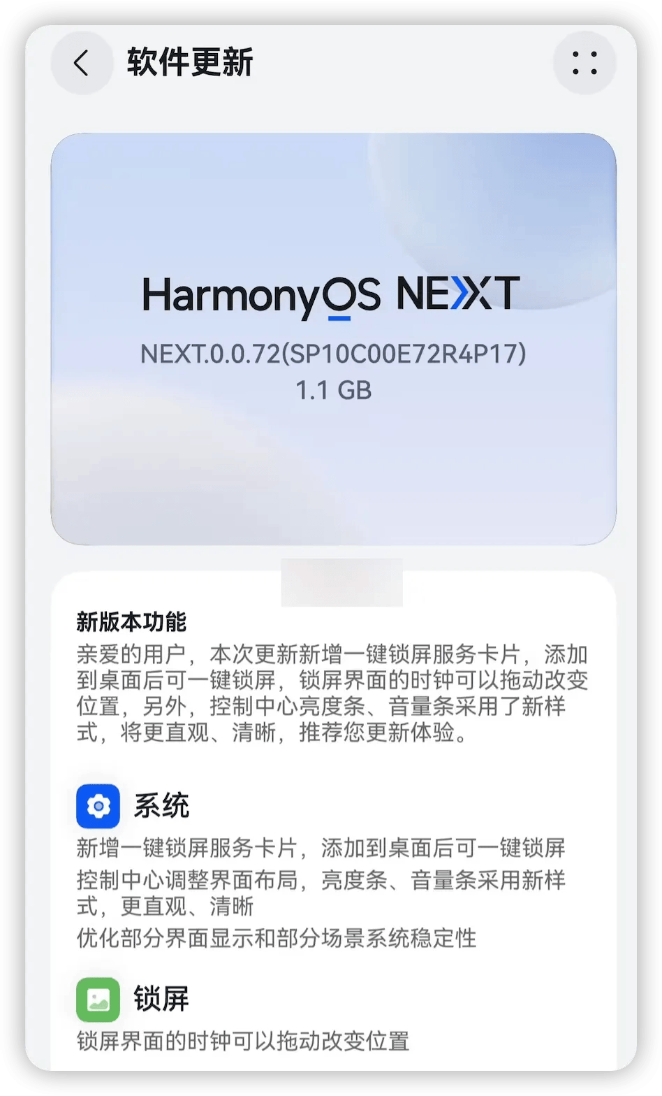 此外,对于已经尝鲜的用户来说,近日鸿蒙 HarmonyOS NEXT.0.0.72 版本也开启了推送,大小约 1.1GB。