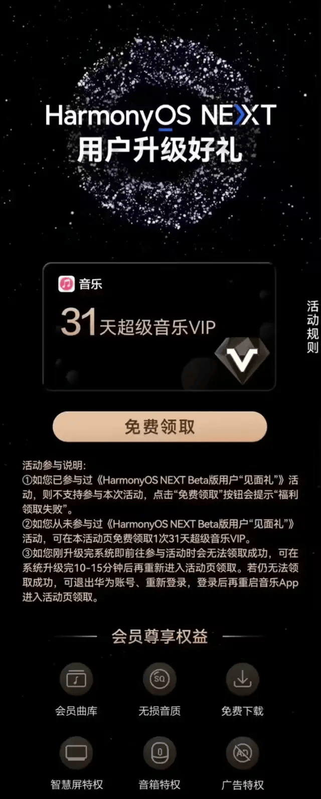 简单来说,已升级鸿蒙 HarmonyOS NEXT 系统的用户,可以获赠 31 天「超级音乐 VIP」。
