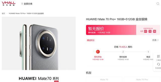 新浪科技讯 11月18日下午消息,今日12时08分,华为Mate70系列手机正式开启预订。预约页面显示,该款新品包括Mate 70、Mate 70 Pro和Mate 70 Pro+三款机型,预约结束时间为11月26日14时,正式开售时间11月26日18时08分。新品报价暂未公布,预约无需支付订金,为免费预约。