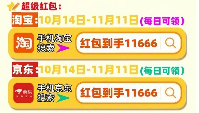 首先,划重点!今年天猫/淘宝和京东的双十一红包口令都是「红包到手11666」要记住!领的红包大小和你搜索的什么口令有关的!这个双平台通用口令包领到大的!记得每天去领!