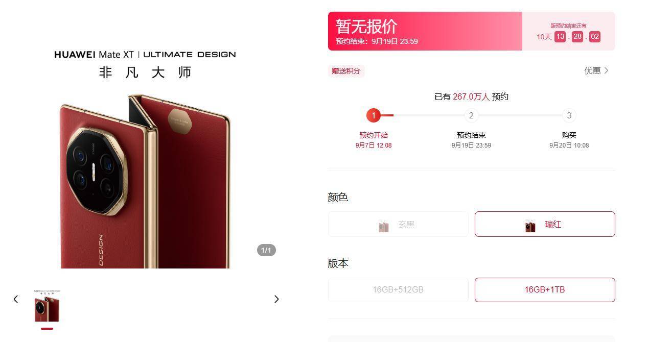 除了设计引发热议,很多人最关心的莫过于这款手机的价格。截至9月9日上午10时,HUAWEI Mate XT非凡大师预约量已经达到267万人,预约时间要到9月19日23:59结束,这意味着,9月10日下午发布会之后,还无法抢购这款手机。