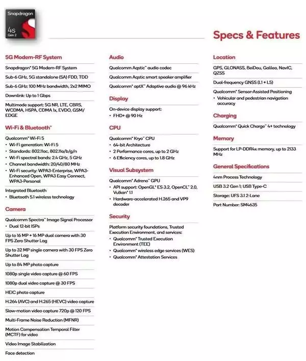 据悉,高通骁龙4s Gen 2移动平台代号SM4635,采用三星4nm工艺打造,CPU为八核心设计,包括2个高性能内核,最高可达2GHz,6个高效能内核,最高达1.8GHz,支持Wi-Fi 5、蓝牙5.1、 5G NR,最高支持8400万像素照片拍摄,支持录制1080P 60P视频,支持FHD+ 90Hz屏幕,支持最高2133MHz的LPDDR4X运行内存。