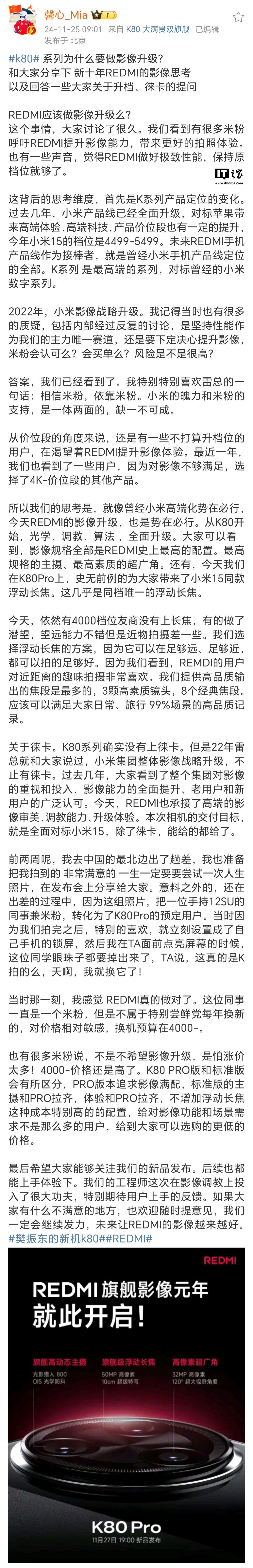 REDMI 产品经理胡馨心今日发文介绍了小米 REDMI K80 系列手机影像配置细节信息,IT之家整理重点内容如下: