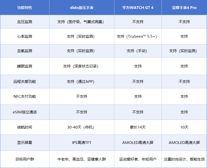 为了帮助大家解决以上疑问,我们挑选了目前市面上比较热销的几款智能手表,包括dido血压手表、华为WATCH GT 4、以及荣耀手表4 Pro。这些手表在功能上各有特色,今天我们将从健康监测功能的精准性、适用性和使用便捷性等多个角度进行全面对比,帮助你为父母挑选到最合适的健康助手。