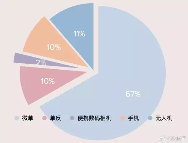 据调查,共292组优秀作品中,有195组作品,大约67%都来源于微单相机、大约10%的作品来源于单反相机、大约2%的作品来源于便携数码相机、大约10%的作品来源于手机、大约11%的作品来源于无人机。