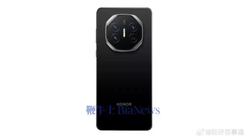 图一清晰地展示出了荣耀Magic7令人瞩目的设计亮点——极具特色的八边形镜头模组设计,深沉的黑色调赋予了它一种神秘而稳重的气质。当人们看到这款手机时,会惊讶地发现其在外观设计上与华为Mate XT有着异曲同工之妙,棱角分明的八边形镜头模组设计、低调典雅的银色镜头边框、对称的镜头分布,整机都展现出了简约高端的科技感,同时又散发着独特的时尚魅力。