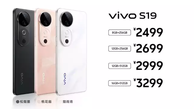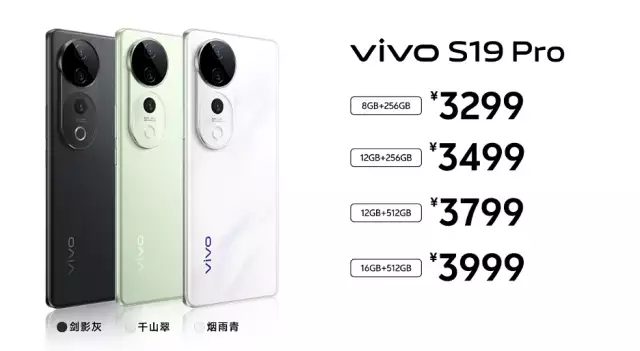 vivo S19:8GB+256GB售价2499元,12GB+256GB售价2699元,12GB+512GB售价2999元,16GB+512GB售价3299元。