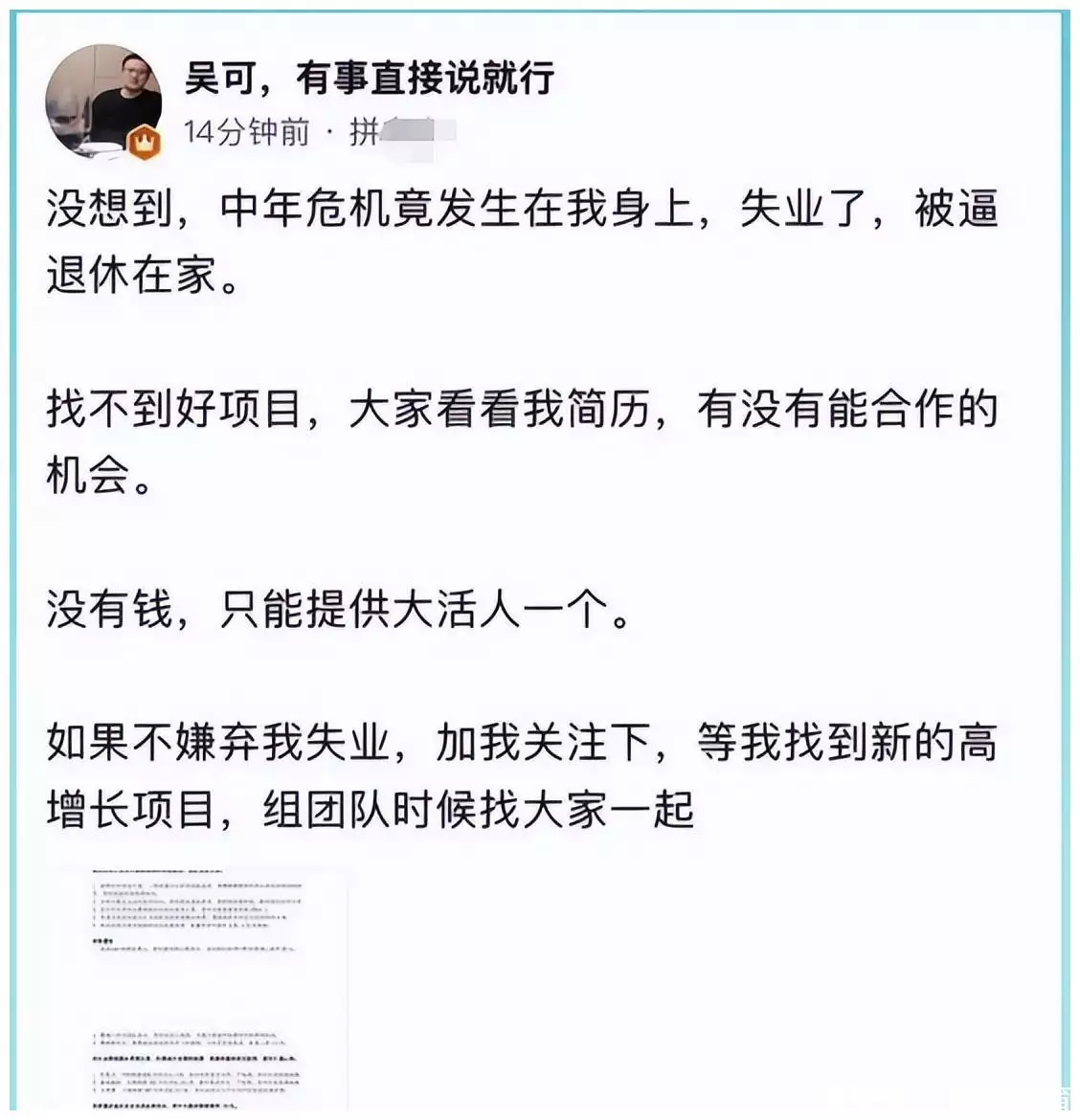 偶然间见到一个热帖,拼xx刚裁了一个是P9级别的员工,这位叫做吴可的前拼XX经理,实际上也是起步于阿里,但是没想到拿了几年拼xx的高薪,还是被裁了。他唏嘘中年危机竟然发生在自己身上,被逼退休在家。并且发出了简历,表明希望合作,但是自己只有人,没有钱,说白了就是你们谁看我合适,就雇佣我,找我谈投资,谈合作,没戏。