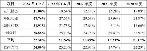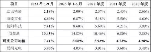 从上表可见,发行人2022年度净利率高达9.56%,是行业平均值4.99%的近两倍,发行人作为一家正在IPO的非上市公司,录得如此净利率可谓不简单,几乎也是行业龙头立讯精密的2倍。