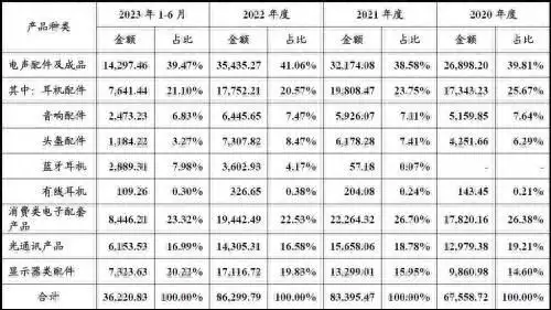 但从上表可见,发行人电声配件及成品业务中耳机配件也即耳机线,报告期内(下同)实现的营业收入分别为:1.73亿元、1.98亿元、1.76亿元以及0.76亿元。发行人的耳机线业务合计实现营收6.25亿元,占全部主营业务收入平均比例约为22.87%,排上表分类产品收入中第二位,仅次于消费类电子配套产品也即数据线品类收入。