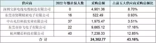 从上表中的缴纳社保人数可见,发行人前五大供应商中,过半数的供应商都为二三十人小厂,甚至上表中的深圳宝新电线电缆制造有限公司不但缴纳社保人数为0,其实收资本也仅仅50万元,而发行人向其合计采购了近0.5亿元的原材料。上述这些小工厂供应商给发行人累计供货约2.43亿元,占前五大供应商供货总额的比例也近一半,具体为上表中的43.16%,业务逻辑让人很是疑惑。