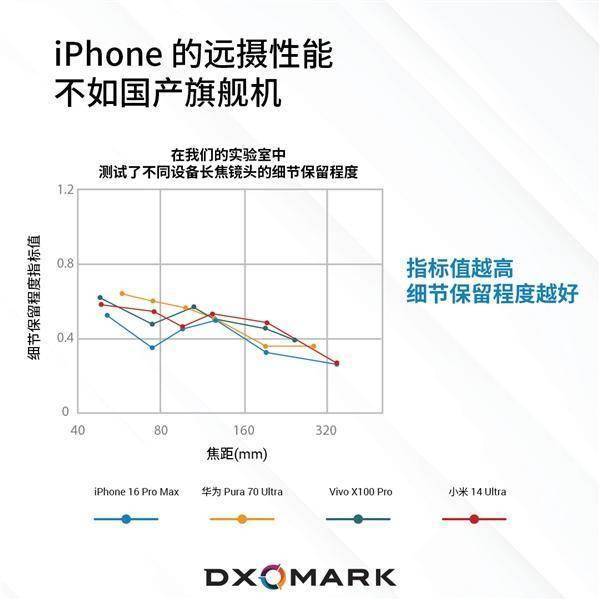 【ITBEAR】DxOMark最新发布的评测报告显示,苹果旗舰手机iPhone 16 Pro Max在长焦镜头拍摄方面表现不佳,与国产旗舰机型相比处于劣势。在这场拍照对决中,国产手机阵营的华为Pura 70 Ultra、小米14 Ultra和vivo X100 Pro展现了强劲实力。