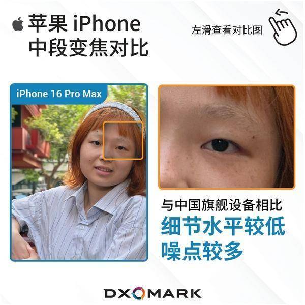 随着放大倍数的增加,两者在细节质量上的差距愈发明显。iPhone 16 Pro Max在拍摄过程中整体噪点较多,皮肤细节丢失严重,清晰度不及国产旗舰机。相比之下,国产旗舰机在人像拍摄方面表现更佳,眼部处理更为锐利,面部皮肤平整度也更高。