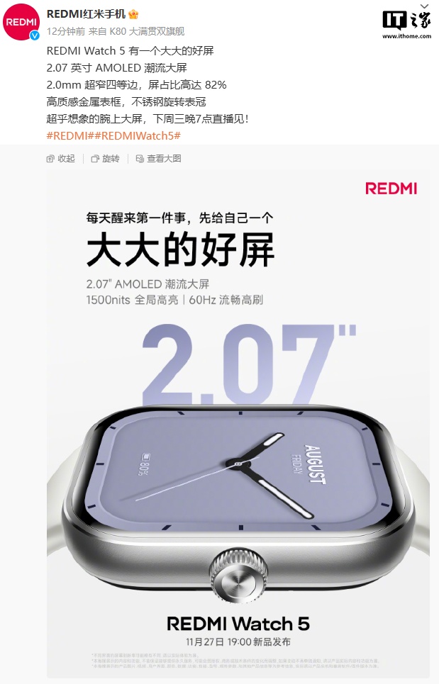 REDMI Watch 5 eSIM 版手表将于今日(11 月 27 日)19:00 正式发布,IT之家全程视频直播,敬请期待。