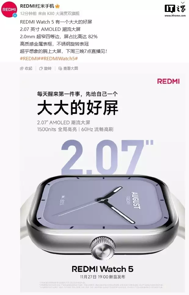 REDMI Watch 5 eSIM 版手表将于今日(11 月 27 日)19:00 正式发布,IT之家全程视频直播,敬请期待。