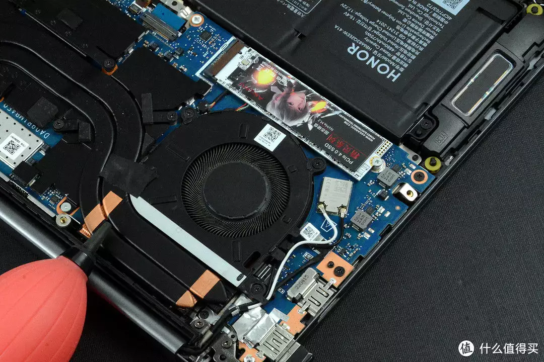 建议更换硬盘的时候建议拔掉电池电源,徒手操作或者用塑料撬棒轻轻翘起就可以了。既然已经打开后盖了,那就顺便做个风扇除尘,一年时间积灰能力也还行,吹一吹就可以了。
