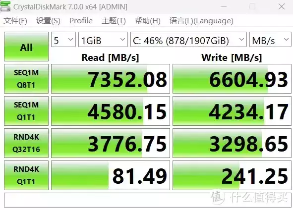 同一块硬盘移动数据根本就不用看速度,对外速度交换又取决于USB接口的速度,所以软件测试还是有一定的参考性的。读取7352MB/s,写入6604MB/s,符合预期,也完全能满足需求了。